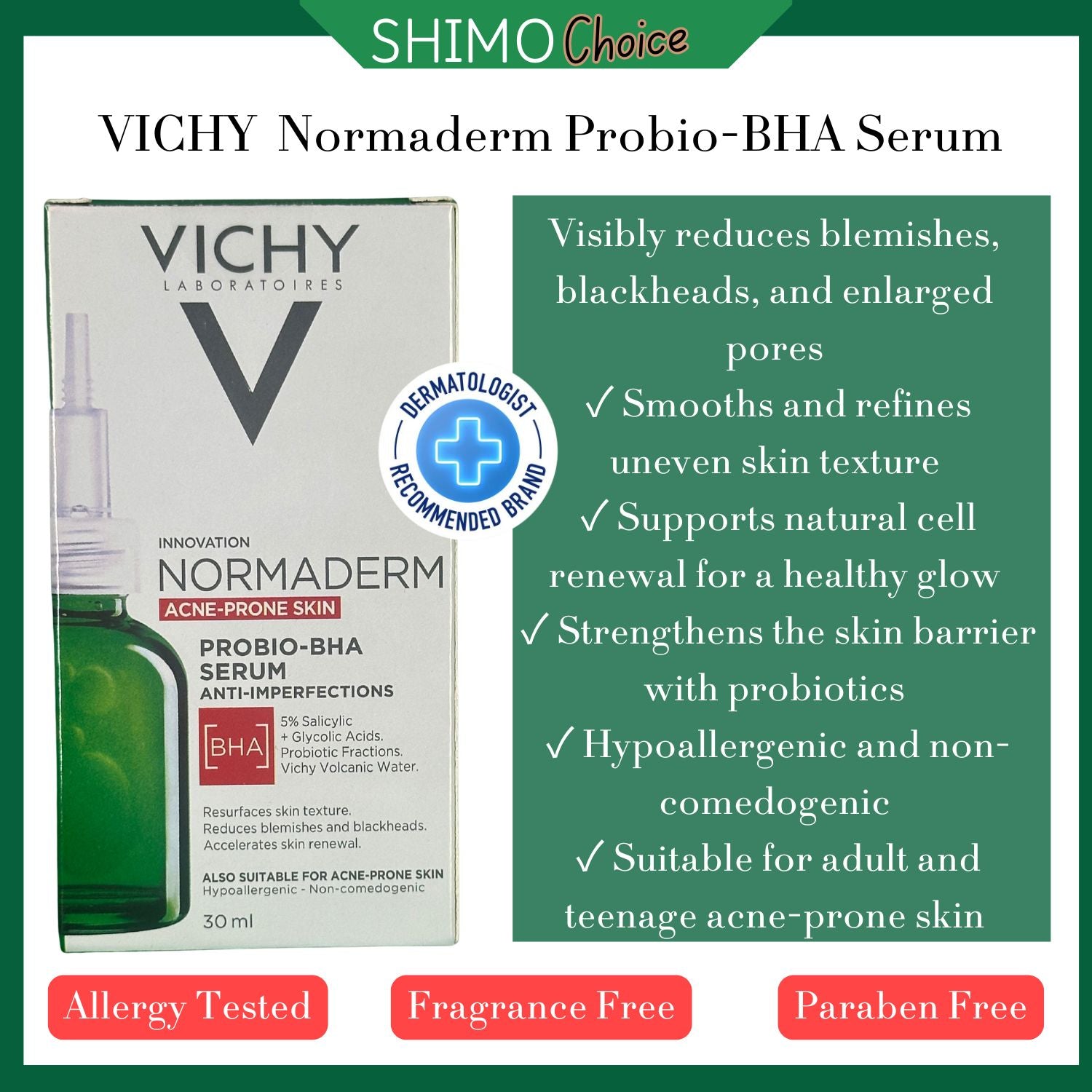 Vichy Normaderm Probio-BHA Serum 30 ml – 5% Salicylic + Glycolic Acid with Probiotic Fractions for Acne-Prone Skin