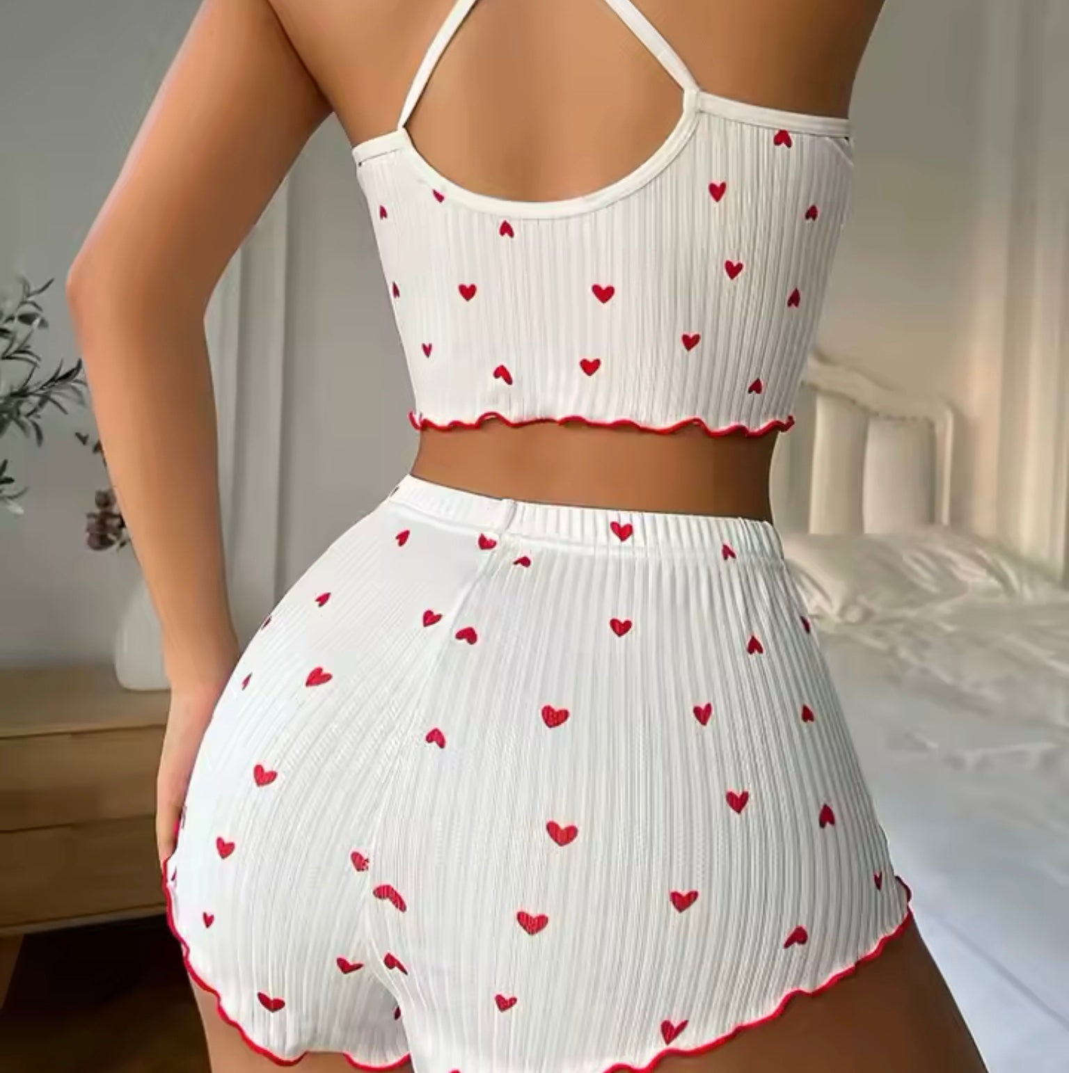 Sleepwear Women Pajamas Set Heart Print Soft Ribbed Fabric with Flirty Frill Trim Casual Cami Top and Shorts Sets Loungewear